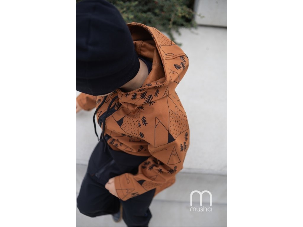 Dětská SOFTSHELLOVÁ bunda s autorským potiskem les a hory skořici.
