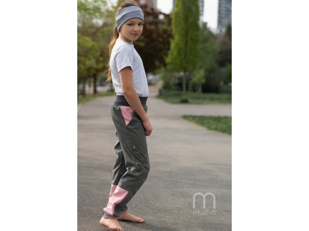 Bavlněné náplety v pase, zakončení nohavic a lemy kapes jsou šedé.