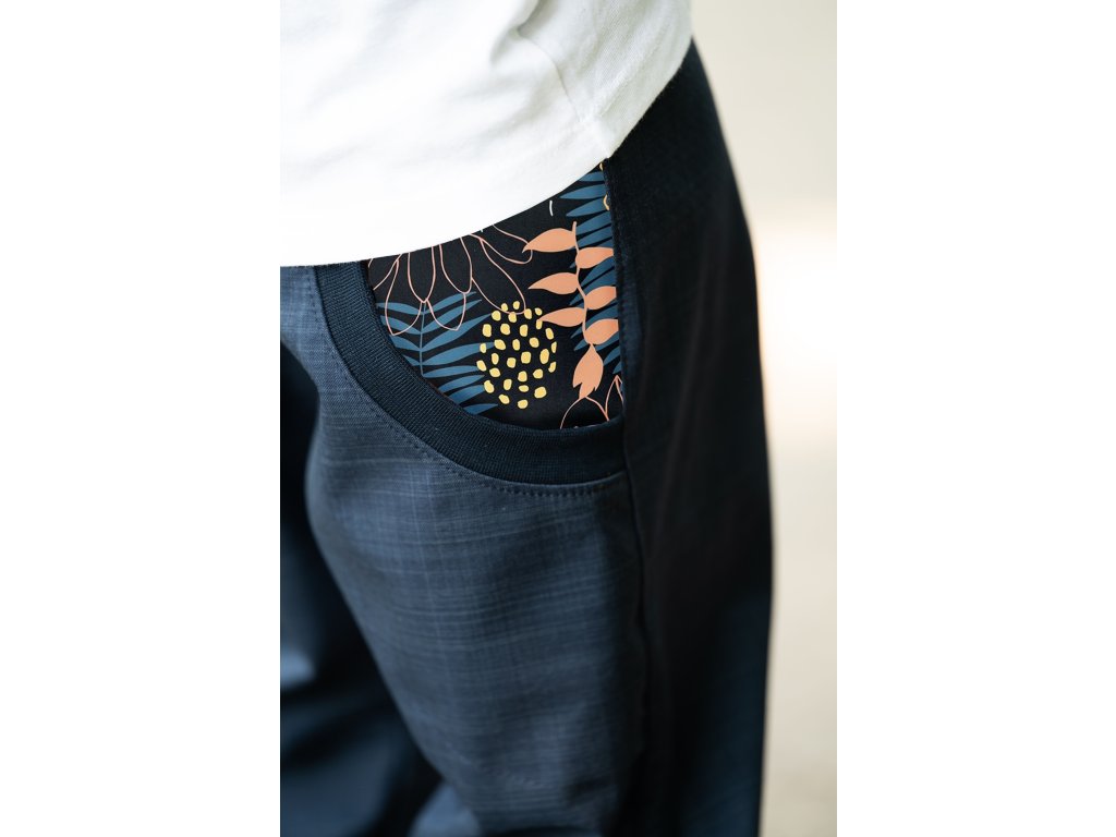 Náplety v pase, zakončení nohavic a lemy kapes jsou ČERNÉ.