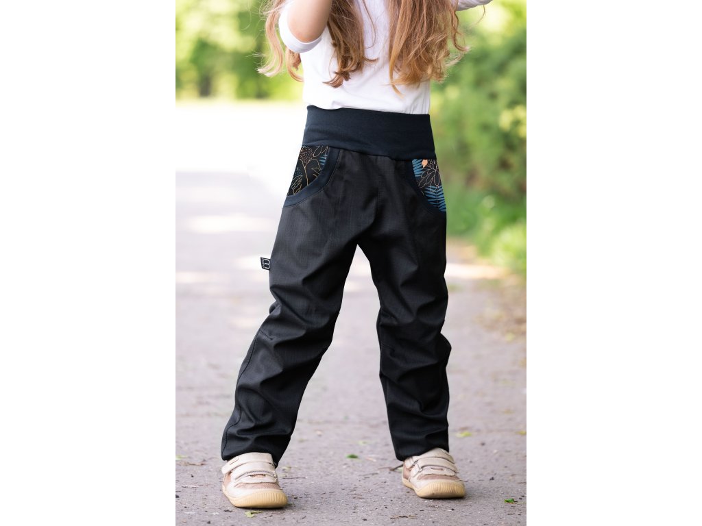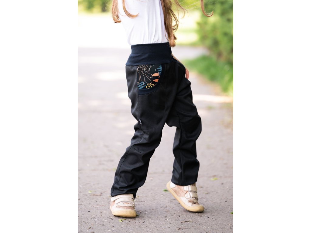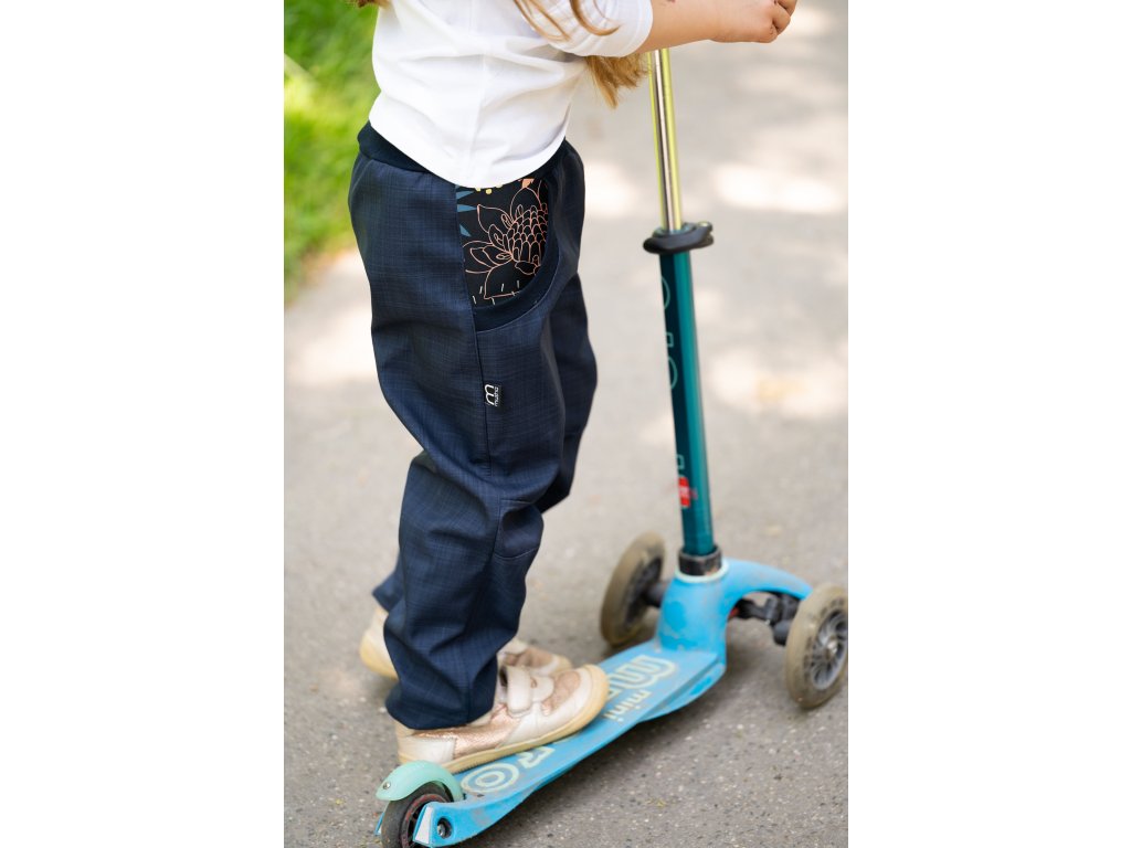 ROSTOUCÍ JARNÍ SOFTSHELLOVÉ kalhoty jaro/podzim lístky a květy na tm.modrém podkladu