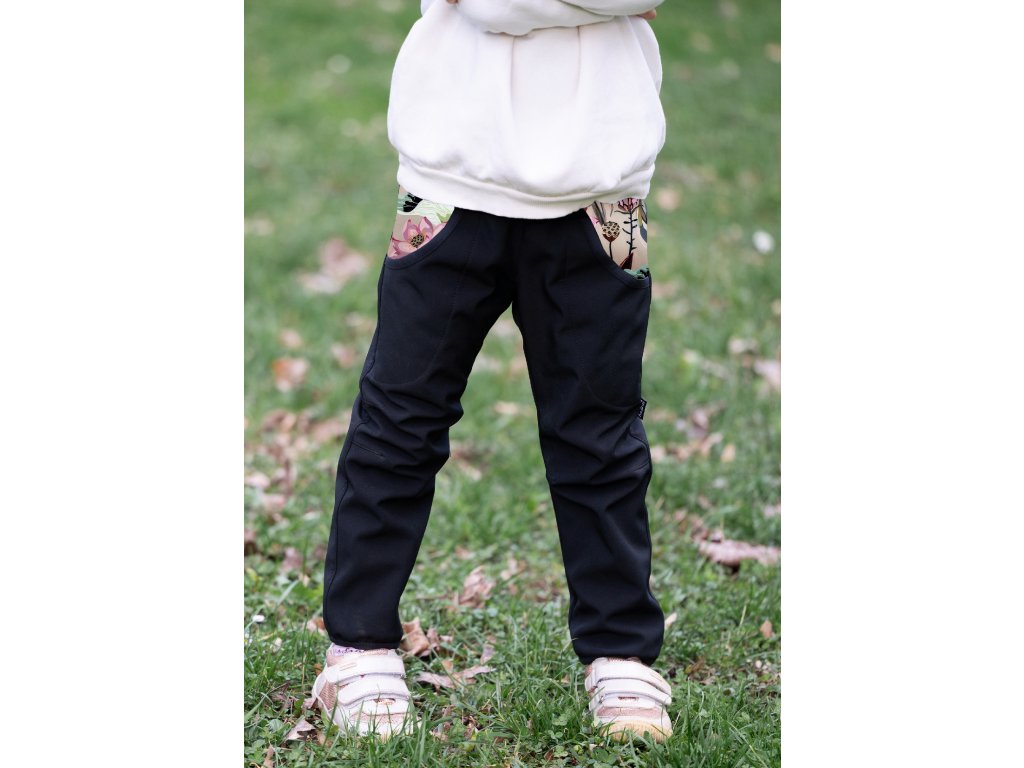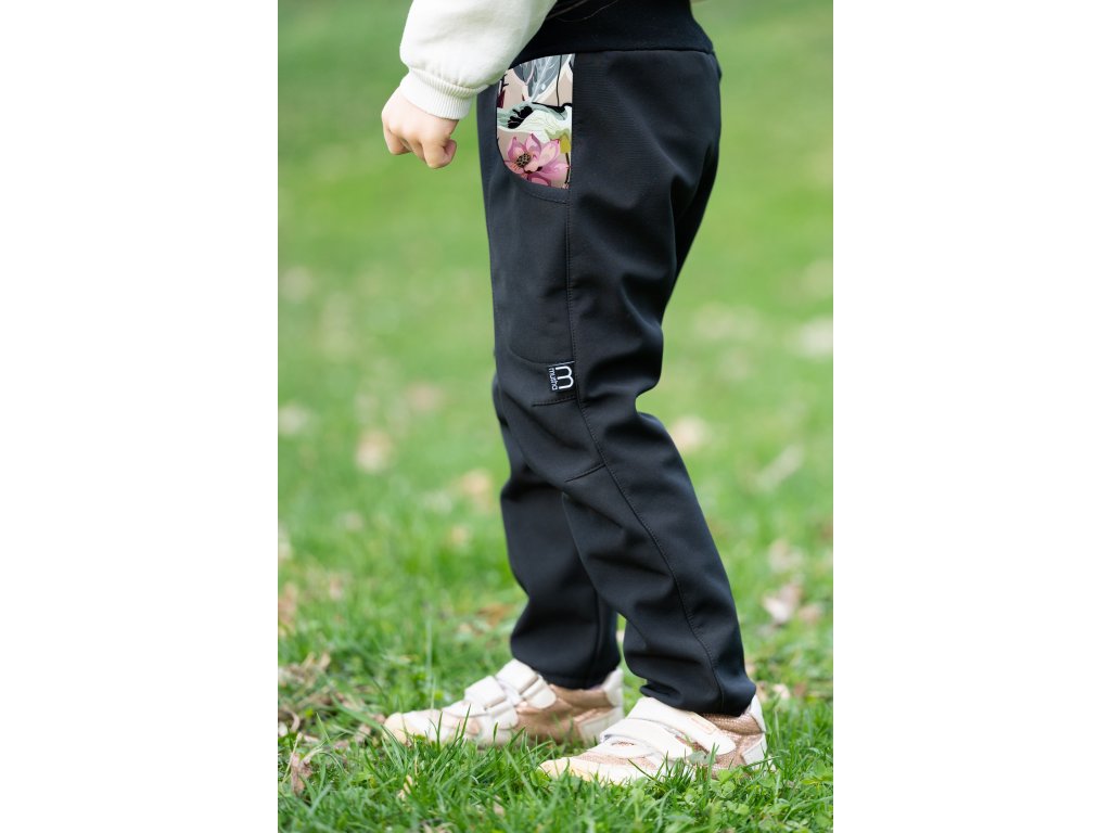 Fleece SOFTSHELLOVÉ kalhoty černá květy na světlém podkladu