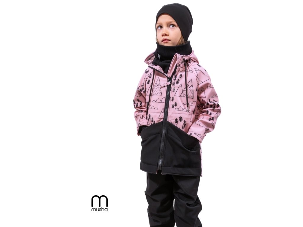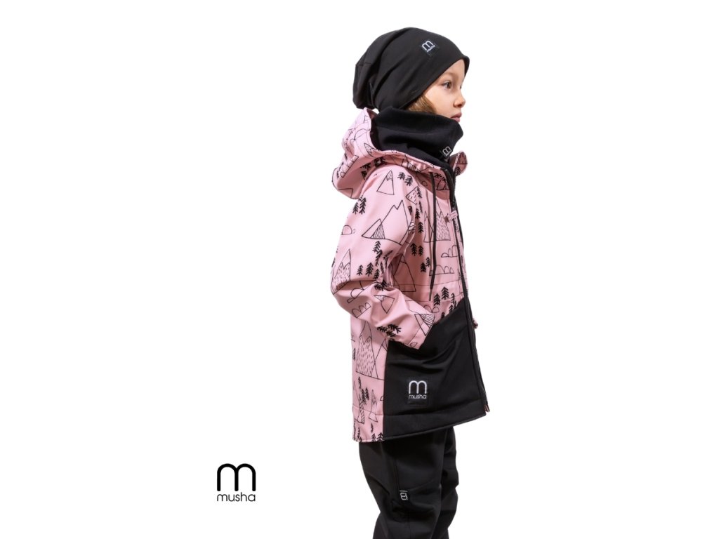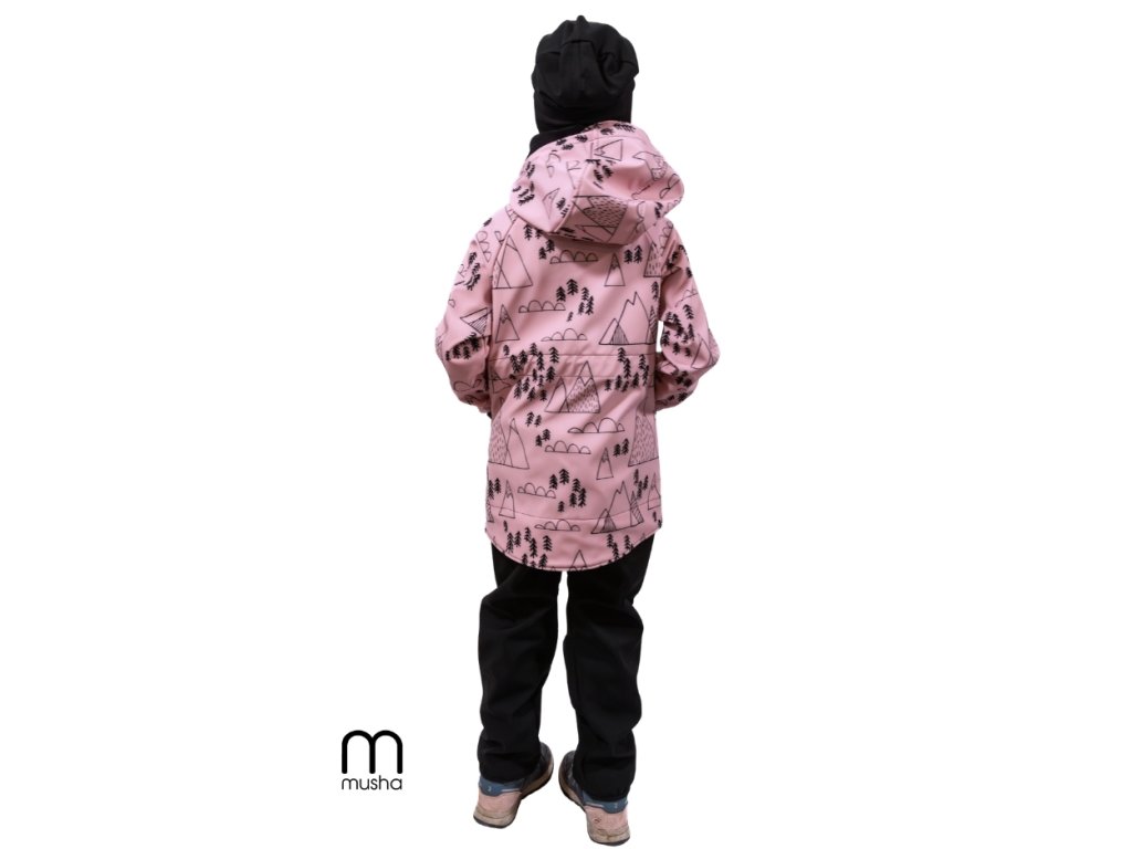 Dětská SOFTSHELLOVÁ bunda les a hory na pudrové růžové/černé kapsy