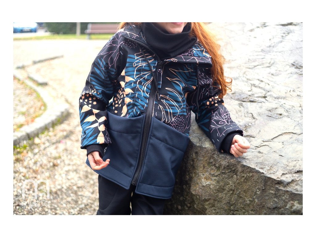 Krásný original potisk softshell s květy na temně modré, tmavě modré kapsy