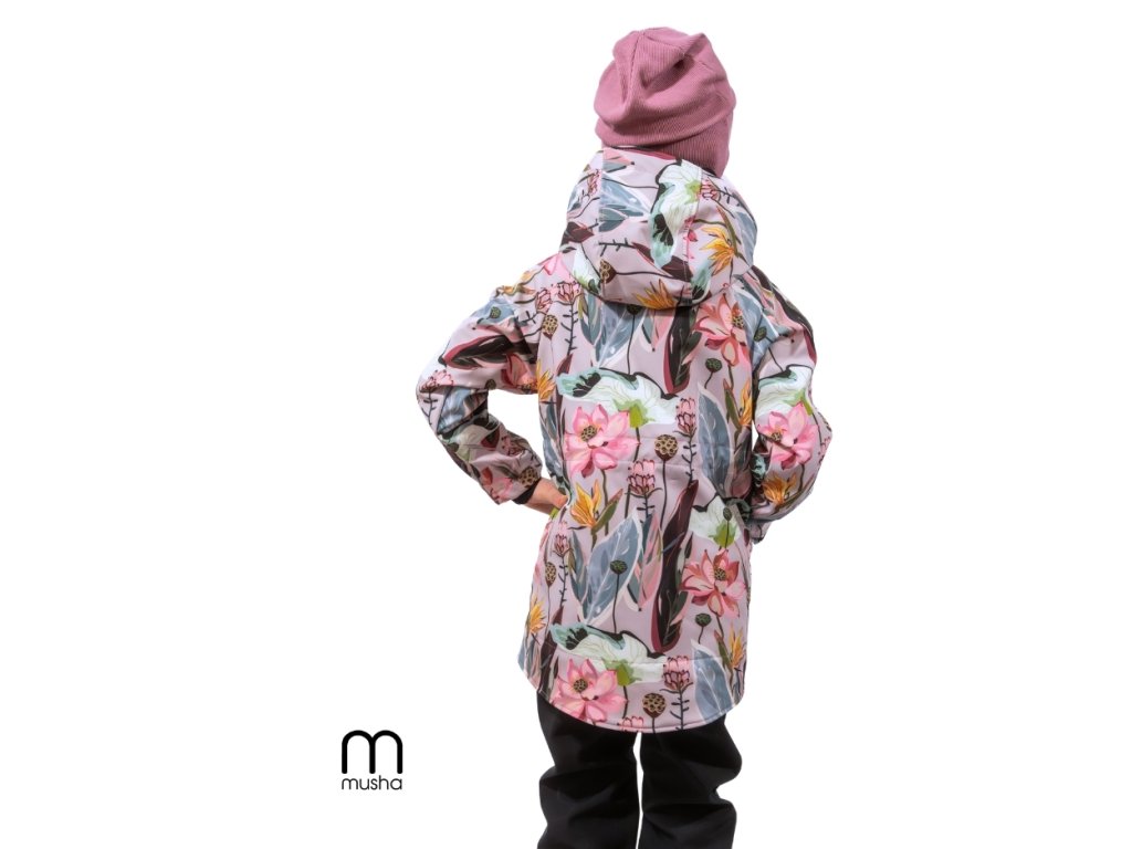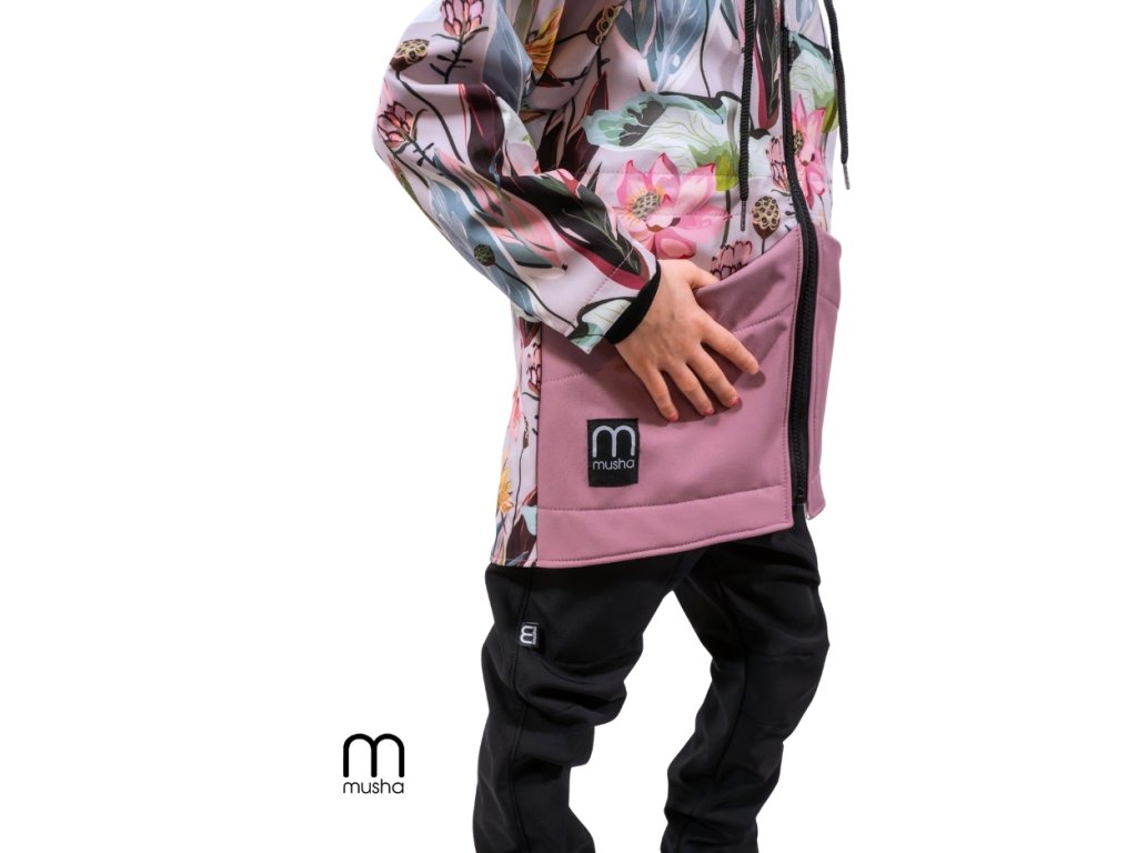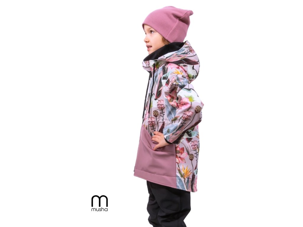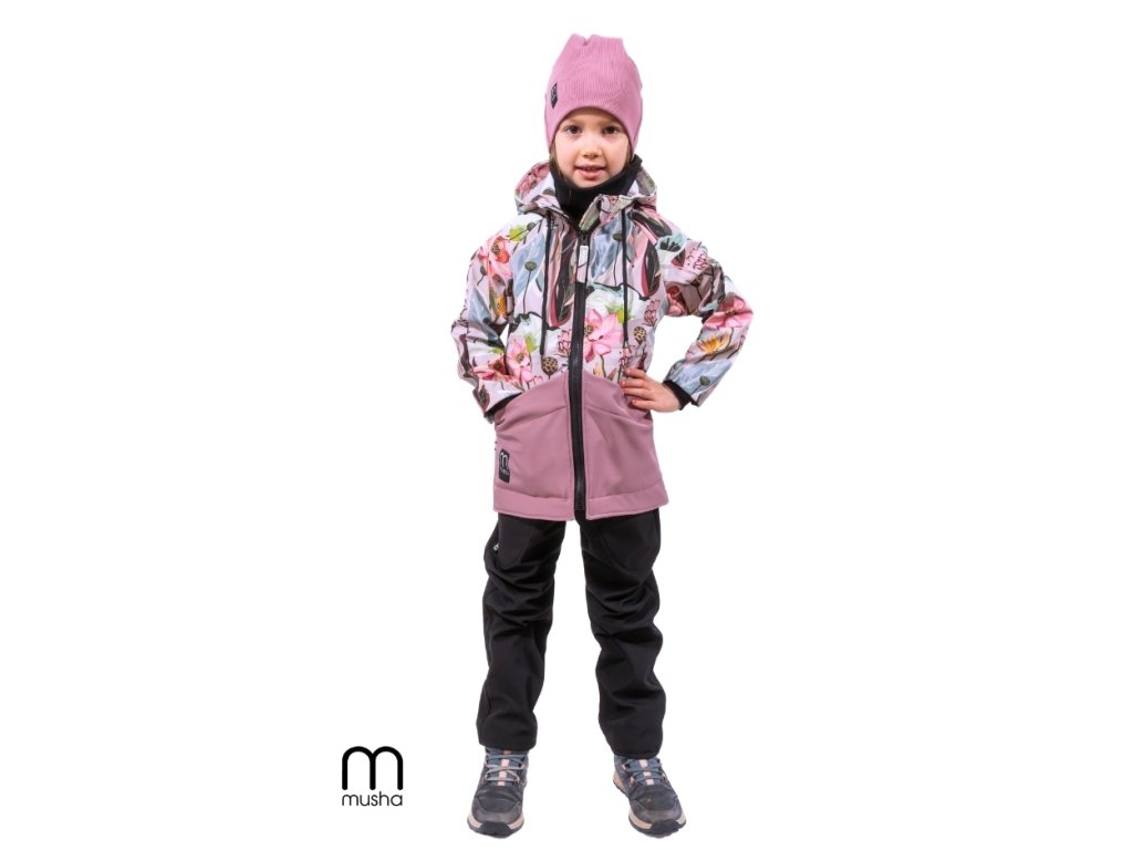 DÍVČÍ SOFTSHELLOVÁ BUNDA květiny/růžové kapsy
